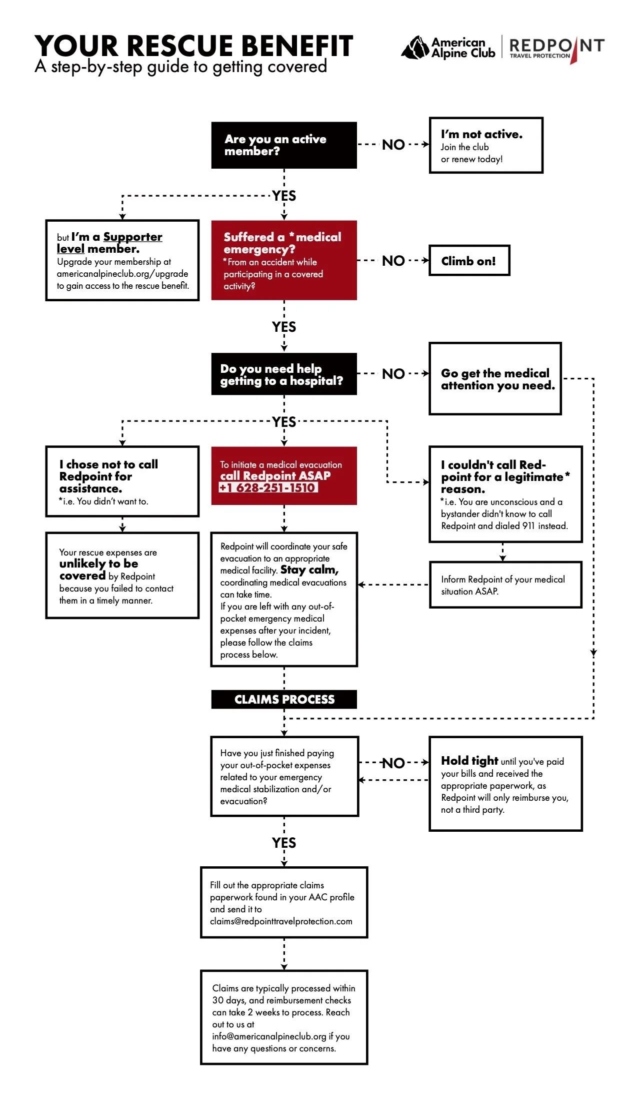 Rescue expense reimbursement process: Let’s make sure you're not left holding the bill because you were unable to call Redpoint to arrange for a rescue. To ensure a seamless coverage experience and a well-coordinated rescue, it’s always best for you to coordinate with Redpoint during a climbing accident. However, if you are unable to contact Redpoint due to your medical condition or circumstances, you're now able to submit a request for reimbursement of up to $7,500 in rescue expenses after an eligible incident. Please see FAQ’s below for exclusions and limitations.